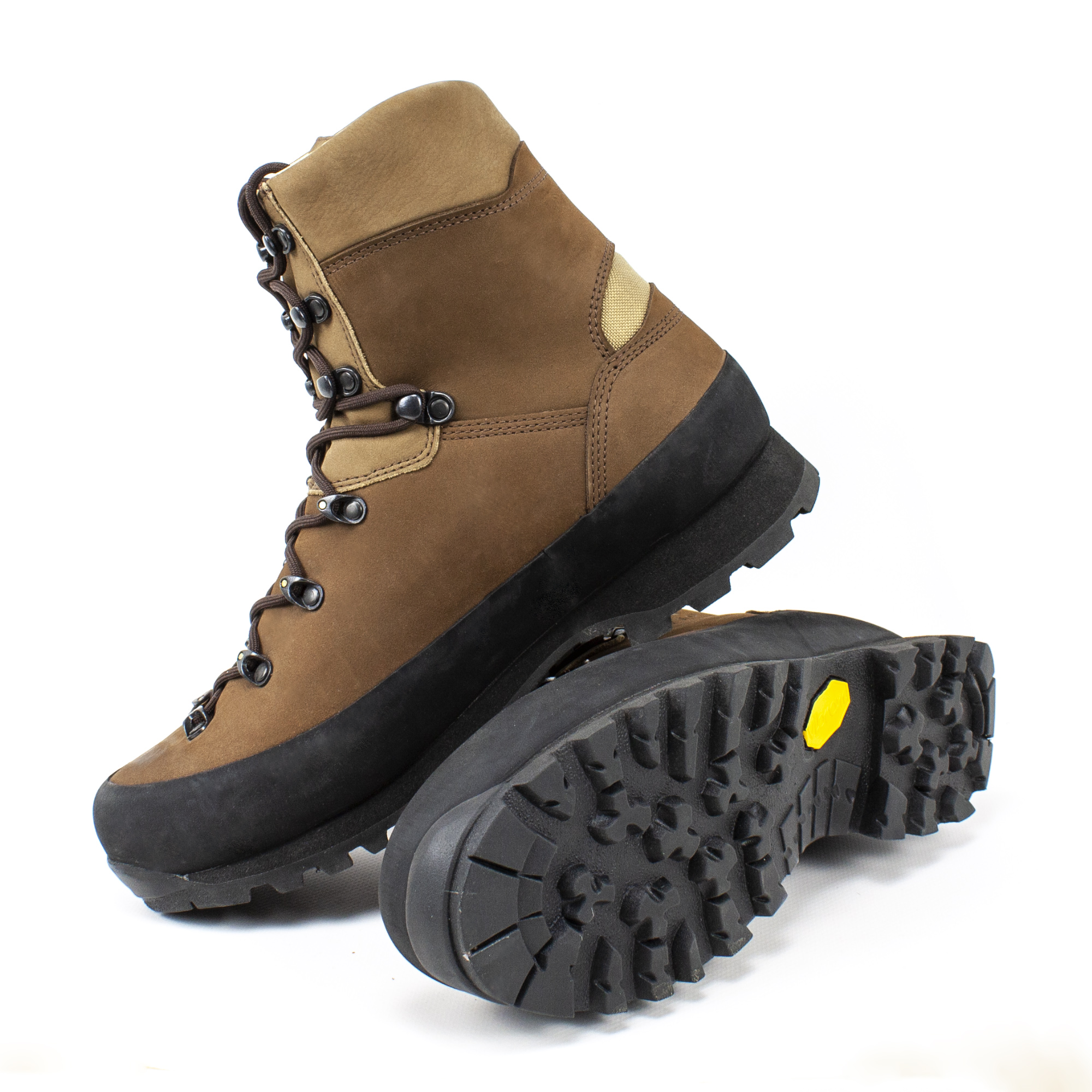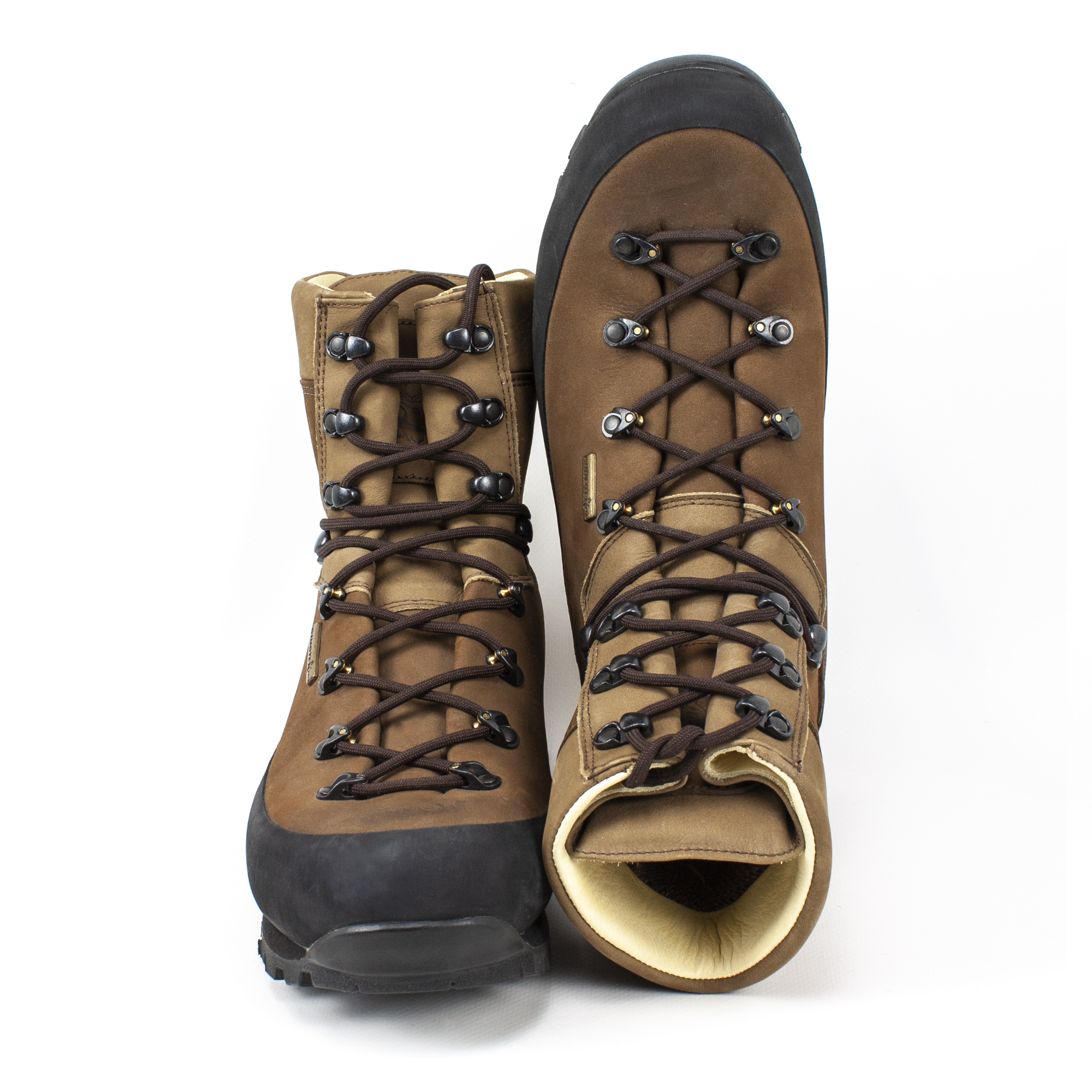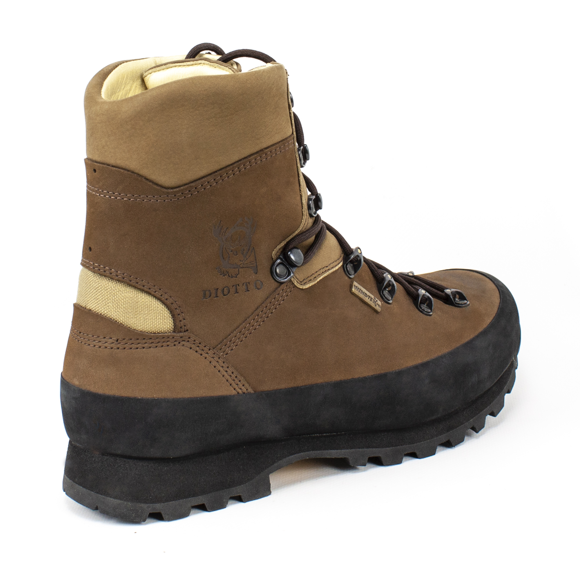 Охотничьи ботинки HL by DIOTTO Nebraska изготовленные из цельного куска водоотталкивающего коричневого нубука с минимальным количеством швов и оснащен дополнительно резиновой лентой по низу ботинка для предотвращения повреждений от курума, острого льда и камней.