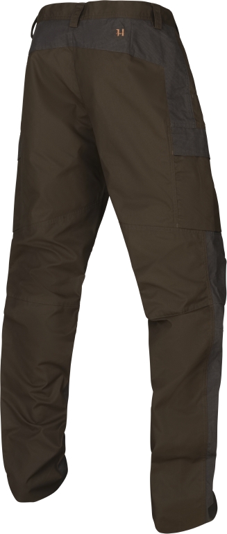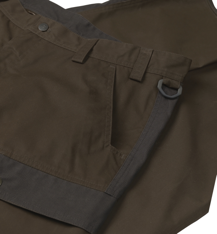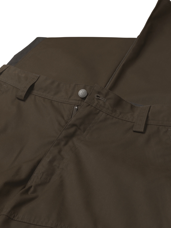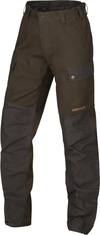 Брюки эргономичного кроя Harkila Asmund изготовлены из эластичной смесевой ткани, в состав которой входит 65% полиэстера и 35% хлопка. Для придания ткани водозащитных свойств, она обработана воском. Пояс застегивается на пуговицу-заклепку, как у классических джинсов. Брюки имеют два кармана на поясе и два спереди на бедрах.