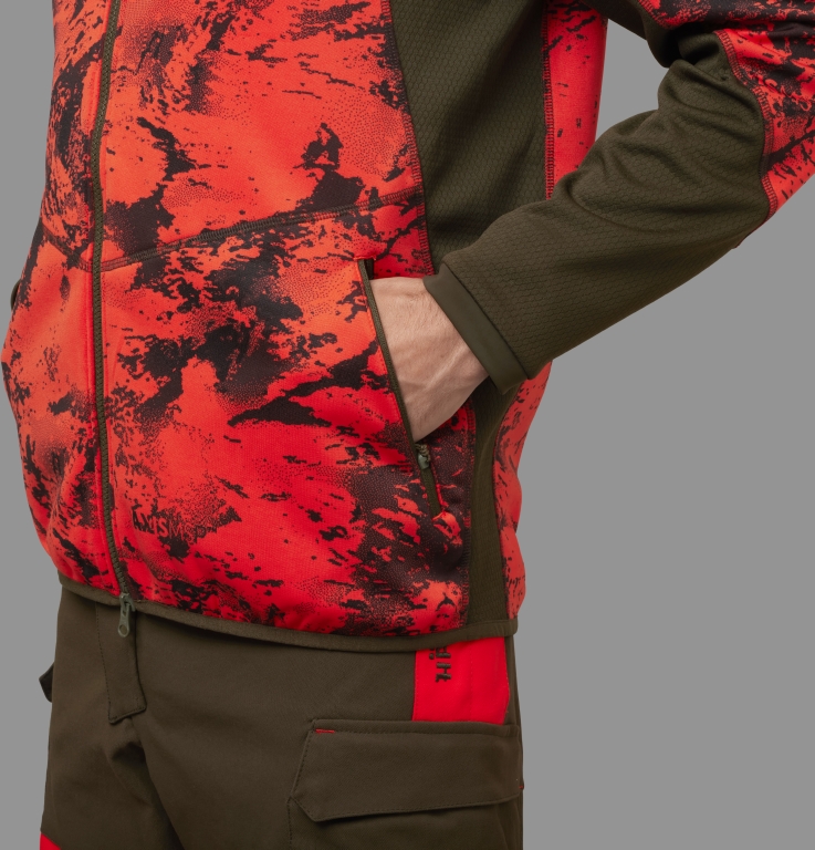 Флисовая куртка Harkila Wildboar Pro Camo имеет высокий воротник и камуфляж AXIS MSP® Blaze, который невидим для дичи, но делает вас хорошо заметным для других охотников. Куртка из из мягкой, высокоэластичной флисовой ткани с очень дышащими вставками по бокам одинаково хорошо работает как теплый средний слой, так и сама по себе как внешний слой в теплую погоду или ходовой охоте при больших нагрузках.