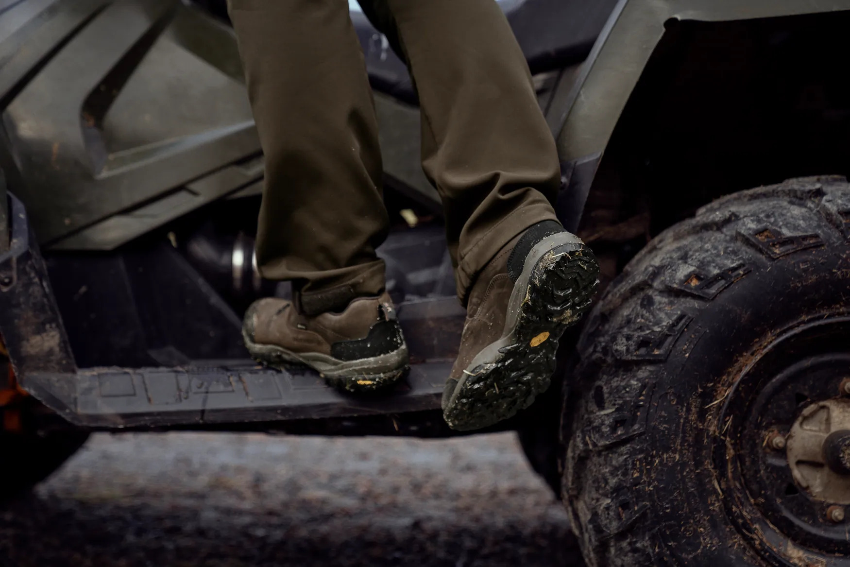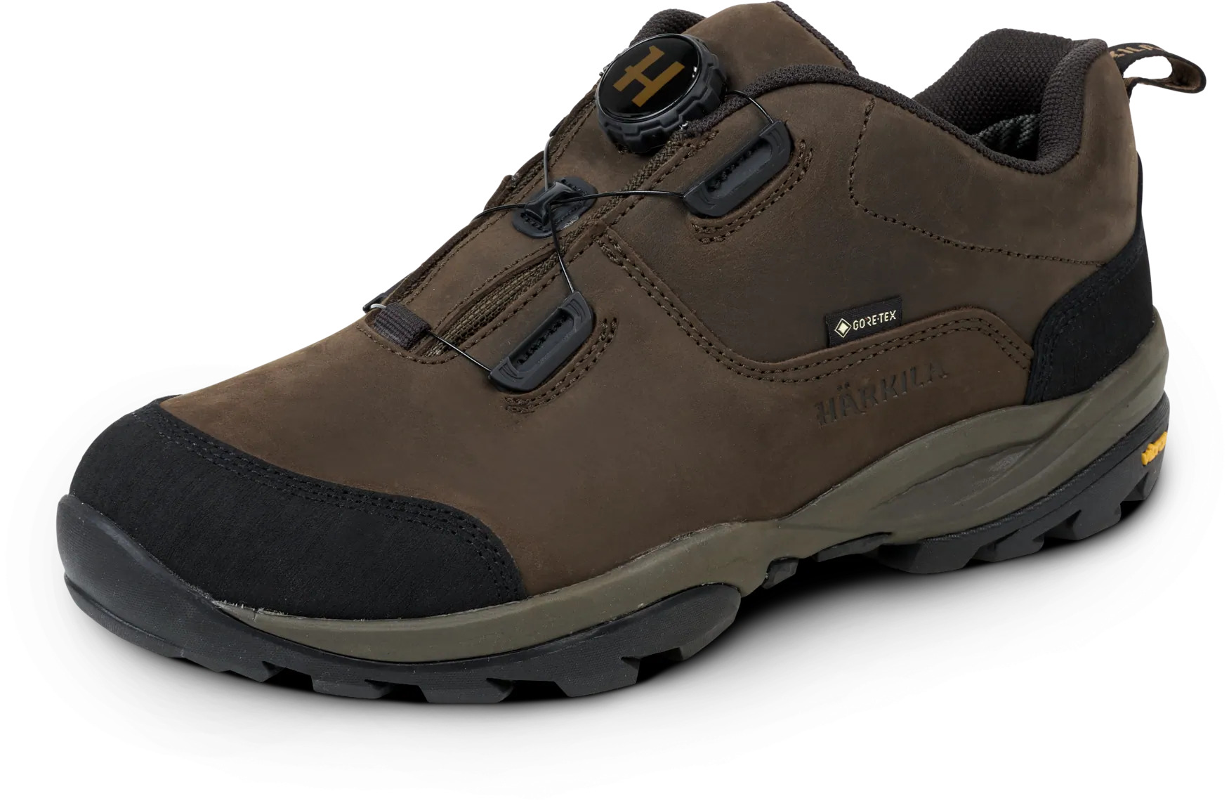 Произведенные в Италии на фабрике, специализирующейся на охотничьей обуви, осенние охотничьи кроссовки Harkila Reidmar Low GTX весят всего около 480 грамм несмотря на то, что сделаны из премиального промасленного нубука. Высота голенища 4" и колодка стандартной ширины. Ботинки оснащены фирменной проволочной застёжкой Harkila, которая застёгивается парой оборотов кнопки и ослабляется поворотом кнопки в противоположном направлении. Премиальная водонепроницаемая мембрана GORE-TEX Sierra обеспечивает комфорт и сухость ног. В процессе производства все мембраны ботинок Harkila тестируются в водяной бане для обеспечения водонепроницаемости. Затем проводится 30-минутный тест на центрифуге 5% от общего количества произведенных ботинок, что является дополнительной гарантией высочайшего качества мембраны. Верх кроссовка Harkila Reidmar Low GTX изготовлен из промасленного нубука. Его дополняет специальная полужесткая подошва Vibram® Campus, обеспечивающая превосходное сцепление с разными поверхностями и элементами рельефа. Промежуточный слой подошвы амортизирует удары для комфорта при ходьбе на большие расстояния даже по очень неровной поверхности. Кроссовки усилены по низу рантами из особо прочного материала в области носка и пятки, где износ обычно наибольший.