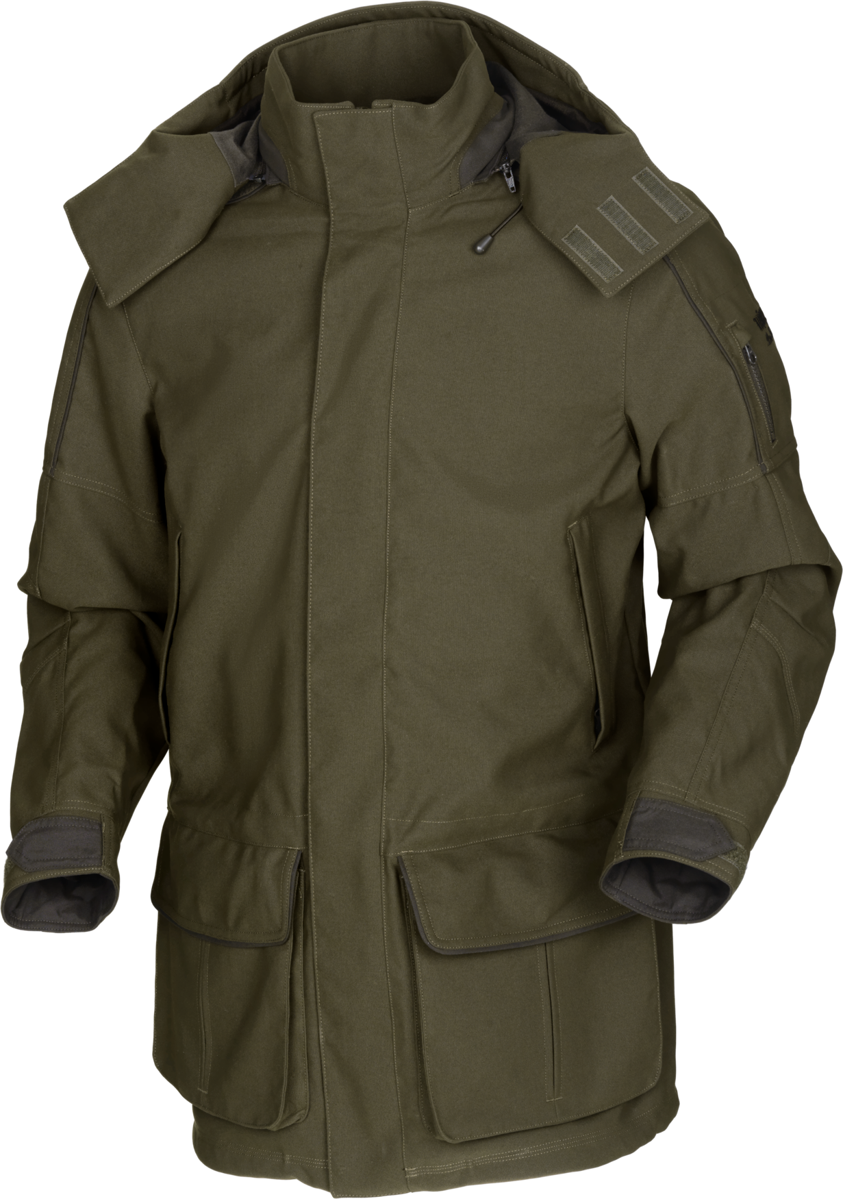 Два больших передних кармана куртки имеют дренажные отверстия, функцию быстрой загрузки QuickLoad (фиксация клапана кармана в открытом положении) и встроенные патронташи под нарезные патроны в обоих карманах. Куртка также оснащена карманами для обогрева рук на флисовой подкладке и карманом для рации или навигатора на левой стороне груди. Также имеется внутренний карман и под ветрозащитным клапаном молнии карман для мобильного телефона или аналогичного устройства, поэтому вам не нужно расстегивать куртку, чтобы получить к нему доступ. Большой карман для дичи на нейлоновой подкладке сзади на спине и небольшой карман на левом рукаве с нашитой оранжевой светоотражающей полосой для дополнительной безопасности. Капюшон съемный и имеет изогнутый козырек. Регулируемые манжеты и регулировки по нижнему краю, талии и капюшону. Прочная двусторонняя тракторная молния, прикрытая ветрозащитной планкой на кнопках.